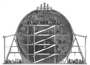 Although Wyld undoubtedly recouped his investment within the first year of opening, over the remaining nine years of its existence the appeal of the Great Globe slowly waned.[52] The attraction continued to draw crowds, but it was never as successful as in 1851 when the Great Exhibition had pulled visitors into the capital. By the mid-1850s the building was looking shabby and Wyld had been forced to start using it as a venue for variety shows.[63] Competition came from Burford's Panorama in the north of the square which ran topical shows just as Wyld did – Burford ran a panorama show of Sevastopol at the same time as Wyld was exhibiting his model.[73] Burford's Panorama was the oldest of its type in London, having been established in 1790, but there were many similar attractions in the capital, among them the Diorama and the Cyclorama in Regent's Park, the panoramas of "London by Day" and "Paris by Night" at the Colosseum, the dioramas at the Gallery of Illustration in Regent Street, and the Panorama of Paris and Versailles in the Linwood Gallery in Leicester Square.[74]