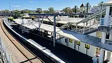 Between April 1982[4] and June 1984, Wyong was the northern extremity of the electrified network.[5] A brick building on Platforms 1 and 2 was replaced by the current structure in the 1990s.[6] On 1 November 1993, an upgraded footbridge with a new ticket office and lifts was opened by Minister for Transport Bruce Baird.[7]