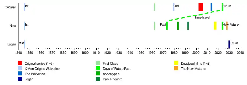 After each film outgrossed its predecessor, a further ten films were released set in the same cinematic universe, with spin-offs including three Wolverine films (2009–2017), two Deadpool films (2016–2018), and two television series titled Legion (2017–2019) and The Gifted (2017–2019). The 2011 prequel X-Men: First Class acted as a soft reboot of the original franchise followed by its 2014 sequel X-Men: Days of Future Past establishing a new fictional timeline focusing on younger iterations of existing characters, continued into a full tetralogy by X-Men: Apocalypse (2016) and Dark Phoenix (2019). The stand-alone New Mutants concluded the series in 2020 after a 20-year-long run.