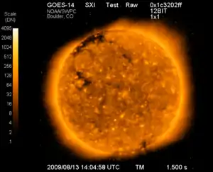 The GOES 14 spacecraft carries on board a Solar X-ray Imager to monitor the Sun's X-rays for the early detection of solar flares, coronal mass ejections, and other phenomena that impact the geospace environment.[1] It was launched into orbit on June 27, 2009, at 22:51 GMT from Space Launch Complex 37B at the Cape Canaveral Air Force Station.
