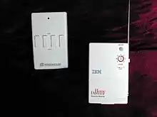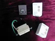 X10 controllers: A simple controller (bottom left), a radio controller (top center), and an original controller (bottom right) usable with an ultrasonic remote control
