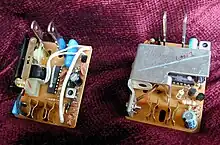 X10 modules: The interior of an appliance module (note the impulse relay on the left) and a lamp module (note the TRIAC and heat sink)