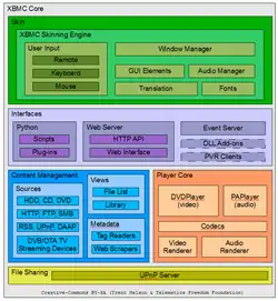 Kodi (formerly XBMC) is a free and open-source media player and technology convergence software application developed by the Kodi Foundation, a non-profit technology consortium.[5] Kodi is available for multiple operating systems and hardware platforms, with a software 10-foot user interface for use with televisions and remote controls. It allows users to play and view most streaming media, such as videos, music, podcasts, and videos from the Internet, as well as all common digital media files from local and network storage media, or TV gateway viewer.[6]