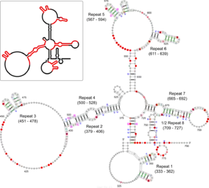 The Xist RNA contains a region of conservation called the repeat A (repA) region that contains up to nine repeated elements.[17] It was initially suggested that repA repeats could fold back on themselves to form local intra-repeat stem-loop structures. Later work using in vitro biochemical structure probing proposed several inter-repeat stem-loop structures.[8][17] A recent study using in vivo biochemical probing and comparative sequence analysis proposed a revision of the repA structure model that includes both intra-repeat and inter-repeat folding found in previous models as well as novel features (see Figure). In addition to its agreement with the in vivo data, this revised model is highly conserved in rodents and mammals (including humans) suggesting functional importance for repA structure. Although the exact function of the repA region is uncertain, it was shown that the entire region is needed for efficient binding to the Suz12 protein.[17]