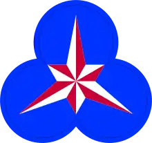XXXVI Corps was activated on 15 July 1944 at Fort Riley, Kansas, under the command of Major General Jonathan W. Anderson and was assigned to the Fourth Army.[1] The shoulder patch was approved on 17 October 1944. A blue trefoil with a six-pointed red and white design indicated the corps' numerical designation. When stations and units assigned to the Second Army located west of the Mississippi River were transferred to the control of the Fourth Army effective 18 September 1944, the XXXVI Corps assumed control of corps-level troop units at Camps Howze and Maxey, Texas, and Camp Robinson, Arkansas. On 6 October 1944, the units at Camp Robinson were relieved from assignment to the XXXVI Corps. The Corps later assumed command of units at Camp Chaffee, Arkansas, and Camp Gruber, Oklahoma.[2] On 5 January 1945, the headquarters of Fourth Army and the Special Troops detachments of Camps Chaffee, Gruber, and Robinson prepared to assume administration of the corps-type units located there, from which the XXXVI Corps was relieved responsibility on 10 January 1945 for an anticipated move to Camp Cooke, California. Instead, the XXXVI Corps received changed orders, recalled its units which had already moved to the West Coast, and moved to Camp Gruber, Oklahoma on 16 January 1945. The corps was relieved of both assignment to Fourth Army and responsibility to units at Camp Gruber at midnight on 23 June 1945 and began movement to Camp Callan, California.[3] It was inactivated there on 25 September 1945.[4]