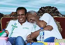 Gusmão declined to run for another term in the April 2007 presidential election. In March 2007 he said that he would lead the new National Congress for Timorese Reconstruction (CNRT) into the parliamentary election planned to be held later in the year, and said that he would be willing to become prime minister if his party won the election.[18] He was succeeded as president by José Ramos-Horta on 20 May 2007.[19] The CNRT placed second in the June 2007 parliamentary election, behind Fretilin, taking 24.10% of the vote and 18 seats. He won a seat in parliament as the first name on the CNRT's candidate list.[20] The CNRT allied with other parties to form a coalition that would hold a majority of seats in parliament. After weeks of dispute between this coalition and Fretilin over who should form the government, Ramos-Horta announced on 6 August that the CNRT-led coalition would form the government and that Gusmão would become Prime Minister on 8 August.[21][22] Gusmão was sworn in at the presidential palace in Dili on 8 August.[1]