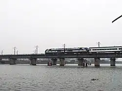 The oldest section on the Xiaoyong railway is the 18.19 kilometres (11.30 mi) section between Ningbo and Cicheng, which opened in December 1912. The Ningbo to Cao'e section, 78 kilometres (48 mi) in length, followed in June 1914, and the Xiaoshan to Cao'e section was completed in October 1936.[2] During the Second Sino-Japanese War in 1938, the railway line was dismantled to prevent its use by the invading Japanese.[2] Following the end of World War II, the railroad right of way was converted into a highway. In 1953, the railway was rebuilt in parts and completed in 1959 with the assistance of Soviet engineers. Between 2002 and 2009, the line was electrified.[2] In 2013, the parallel Hangzhou–Ningbo high-speed railway opens, shifting significant amounts of intercity passenger traffic away from the Xiaoyong Railway and enabling railway to carry more freight and local passenger traffic. Since 2017, a number a commuter railway services started operating on segments of the line, such as Line S1 Ningbo–Yuyao intercity railway operating in Ningbo and Shaoxing Tourism New Transit railway operating in Shaoxing.[3] In 2018, China's first double-stack container trains running under overhead catenary started operation on Xiaoyong railway between Gaobu and the Port of Ningbo-Zhoushan.[4][5]