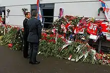 City officials in Yaroslavl announced a three-day period of mourning from Friday 9 September 2011 to Sunday 11 September 2011.[24] On 10 September, memorial services for the players were held in their mother countries. The biggest services were held in Arena 2000, the home arena of Lokomotiv Yaroslavl, with thousands of mourners as well as Russian Prime Minister Vladimir Putin in attendance. Local police determined the crowd number at Lokomotiv's home arena to be roughly 100,000.[50][51]
