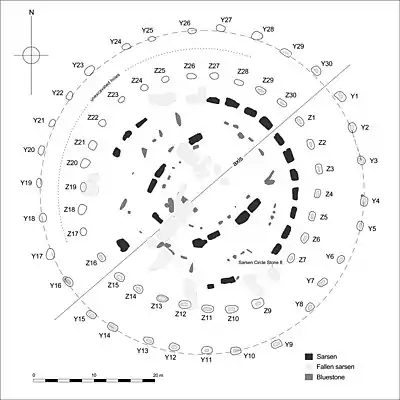 The Y and Z Holes are two rings of concentric (though irregular) circuits of 30 and 29 near-identical pits cut around the outside of the Sarsen Circle at Stonehenge. The current view is that both circuits are contemporary. Radiocarbon dating of antlers deliberately placed in hole Y 30 provided a date of around 1600 BCE, and a slightly earlier date was determined for material retrieved from Z 29.[1] These dates make the Y and Z holes the last known structural activity at Stonehenge.