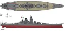 Although five Yamato-class vessels had been planned in 1937, only three—two battleships and a converted aircraft carrier—were completed. All three vessels were built in extreme secrecy, to prevent American intelligence officials from learning of their existence and specifications;[6] indeed, the United States' Office of Naval Intelligence only became aware of Yamato and Musashi by name in late 1942. At this early time, their assumptions on the class's specifications were quite far off; while they were correct on their length, the class was given as having a beam of 110 ft (34 m)—in actuality, it was about 127 ft (39 m) and a displacement of 40,000–57,000 tons (actually, 69,000 tons). In addition, the main armament of Yamato class was given as nine 16 in (410 mm) guns as late as July 1945, four months after Yamato was sunk.[28][29] Both Jane's Fighting Ships and the Western media also misreported the specifications of the ships. In September 1944, Jane's Fighting Ships listed the displacement of both Yamato and Musashi as 45,000 tons.[30] Similarly, both the New York Times and the Associated Press reported that the two ships displaced 45,000 tons with a speed of 30 knots,[31] and even after the sinking of Yamato in April 1945, The Times of London continued to give 45,000 tons as the ship's displacement.[32] Nevertheless, the existence of the ships—and their supposed violation of naval treaties—heavily influenced American naval engineers in the design of the 60,500-ton Montana-class battleships, though they were not designed specifically to counter the Yamato class.[33]
