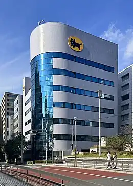 The company's logo is a yellow oval with a black cat carrying her kitten in her mouth, symbolizing the company's promise that they take care of items entrusted to them as though the items were their own family. The company is often colloquially referred to as 黒ねこ (Kuroneko) which means "black cat" in Japanese. The logo is as familiar in Japan as the Coca-Cola logo is in the United States. The logo was developed by founder Yasuomi Ogura.[3]