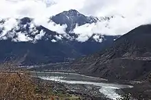 The Yarlung Tsangpo Grand Canyon, also known as the Yarlung Zangbo Grand Canyon, the Tsangpo Canyon, the Brahmaputra Canyon or the Tsangpo Gorge (simplified Chinese: 雅鲁藏布大峡谷; traditional Chinese: 雅魯藏布大峽谷; pinyin: Yǎlǔzàngbù Dàxiágǔ'), is a canyon along the Yarlung Tsangpo River in Tibet Autonomous Region, China. It is the deepest canyon in the world,[1][lower-alpha 1] and at 504.6 kilometres (313.5 mi) is slightly longer than the Grand Canyon in the United States, making it one of the world's largest.[1][3] The Yarlung Tsangpo (Tibetan name for the upper course of the Brahmaputra) originates near Mount Kailash and runs east for about 1,700 kilometres (1,100 mi), draining a northern section of the Himalayas before it enters the gorge just downstream of Pei, Tibet, near the settlement of Zhibe. The canyon has a length of about 240 kilometres (150 mi) as the gorge bends around Mount Namcha Barwa (7,782 metres or 25,531 feet) and cuts its way through the eastern Himalayan range. Its waters drop from about 2,900 metres (9,500 ft) near Pei to about 1,500 metres (4,900 ft) at the end of the Upper Gorge where the Po Tsangpo River enters. The river continues through the Lower Gorge to the Indian border at an elevation of 660 metres (2,170 ft). The river then enters Arunachal Pradesh and eventually becomes the Brahmaputra.[4][5]