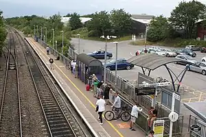 The station is staffed on weekday mornings.[9] It has two staggered platforms, separated by the A432 road bridge. An automated ticket machine was installed in mid-2007, but stopped functioning due to vandalism and is reported to be "unlikely to be replaced in the foreseeable future".[10] A new ticket machine was installed in 2013 on platform 1, whilst the portakabin ticket office is on the opposite platform. Digital information screens, customer help points and timetable posters provide train running information, whilst CCTV was installed here in 2011.[11] Step-free access to both platforms is available (via ramps from the road bridge to platform 1).
