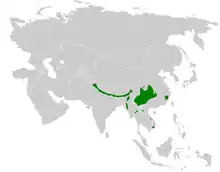 It is found in the southern Himalayas, Northeast India and southern China with smaller amounts in Southeast Asia. Its natural habitats are subtropical or tropical moist lowland forest and subtropical or tropical moist montane forest.[1][4]