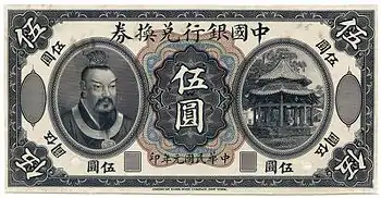 Bottom image: A 100-yuan banknote displaying the Yellow Emperor, issued in 1938 by the Federal Reserve Bank of China of the Provisional Government of the Republic of China (1937–40), a Japanese puppet regime in North China