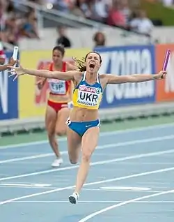 ![]() Bryzhina as the final runner of Ukraine's women's 4x100m relay at the 2010 European Championships | ||||||||||||||||||||||||||||||||||||||||||||||||