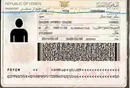 A Yemeni passport is a government document used by citizens of Yemen for international travel.[1] Yemeni passports are issued by the Immigration and Naturalization Service of the Ministry of the Interior, and by some Yemeni consulates and embassies around the world.[2]
