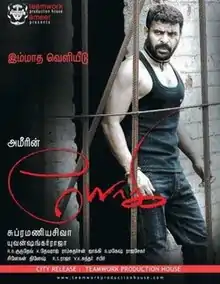 Filming was held for 161 days in various areas in and around Chennai on a cost of nearly 12 crores.[23] The shooting of the film began in mid-November 2007 and was completed by mid-July 2009. Since the story is said to revolve around a slum dweller in an urban slum, shooting was mainly held around slum areas in Chennai as in Egmore, Saidapet, Chennai Central and Teynampet.[24] The various locations in Chennai include the Chennai City Centre and the Sathyam Theatre, for which the unit had to get permissions first, which was said to be very costly and one main reason for the delay of the shooting.[23] Several fight scenes in the climax were shot at the terrace of Big Bazaar in Vadapalani, at Ennore and a house in Besant Nagar.[25] In August 2009, however, it was reported, that "last leg shooting" was being held in Thiruvottiyur in Chennai at the famous Vadivudaiyamman Temple.[26] In April 2008, reports claimed, that Ameer was injured during the shooting, which was going on at the AVM Studios, when he was jumping from 40 meter high and sustained fracture in his right hand.[27]