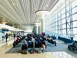 Plans also include turning the airport land into an airport city integrated with industrial and tourism areas. The airport is designed to be resistant to earthquakes measuring up to 8.8 on the Richter magnitude scale as it was constructed in an earthquake-prone area, and will be equipped with tsunami mitigation facilities.[10] At present part of the terminal, about 129,000-square-meter is completed and used. When completed the terminal will spread over 210,000 sqm.[11] There will be three islands of check-in counters, with 32 counters in each of the islands. Parts of the airport feature local traditional artwork and local wisdoms, represented by the Jasmine flower and Wijayakusuma (Epiphyllum oxypetalum), designed by local artists.