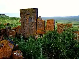 The memorial is located in the mountains 8 kilometres (5.0 mi) south-east of the ruins of the fortified Urartian settlement of Teyseba, also known as Odzaberd and near the modern-day village of Tsovinar. Geographically it is located at the south-east corner of Lake Sevan, which can be seen in the distance at a highpoint amongst the ruins of Khrber where the memorial lies within. There are a number of medieval khachkars, headstones, and tombs in Khrber. The oldest graves are located at the base of a hill just south of the ruins.[1]