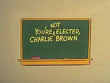 The plot from You're Not Elected, Charlie Brown was taken from a story that ran in the comic strip in October 1964, in which Linus runs for school president with Charlie Brown as his running mate. In the original storyline, Linus blows the election (and Charlie Brown's bid for Vice President) after bringing up The Great Pumpkin in his final speech and being laughed off stageagain after leading in the polls at the time. Unlike the television special, Linus' opponent is never seen or mentioned. This special first aired under the title You're Elected Charlie Brown. It was subsequently changed after Charles Schulz realized that Charlie Brown was neither elected nor does he run. This explains why there is a caret between the words "You're" and "Elected" on the chalkboard (there was no time to redo the entire cel).