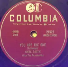 "You Are the One" is a song written by Pat Patterson, performed by Carl Smith (with the Tunesmiths), and released by Columbia Records (catalog No. 21522).[1] In June 1956, it entered Billboard magazine's country charts, peaked at No. 4 on the disc jockey chart (No. 5 juke box), and remained on the chart for 23 weeks.[2]