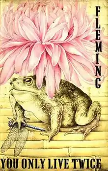 You Only Live Twice was published in the UK on 16 March 1964,[32] by Jonathan Cape and cost sixteen shillings.[33] There were 62,000 pre-orders for the book,[34] a significant increase over the 42,000 advance orders for the hardback first edition of On Her Majesty's Secret Service.[35] Richard Chopping, cover artist for The Spy Who Loved Me, was engaged for the design.[32] On 17 July 1963, Michael Howard of Jonathan Cape had written to Chopping about the artwork, saying: "I have had a talk with Ian about the ideas for the ingredients of this design. He is very much in favour of the toad ... but with a suitable array of oriental embellishrangment, i.e. toad plus Japanese flower arrangements, which he thinks should be sitting in a suitable piece of Japanese pottery, perhaps ornamented with a dragon motif. If you could manage a pink dragonfly sitting on the flowers, and perhaps just one epicanthic eye peering through them he thinks that will be just splendid!"[36] Chopping's fee rose to 300 guineas for the cover[37] from the 250 guineas he received for The Spy Who Loved Me.[38]