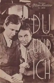 You and I (German: Du und ich) is a 1938 German romance film directed by Wolfgang Liebeneiner and starring Brigitte Horney, Joachim Gottschalk and Paul Bildt.[1]