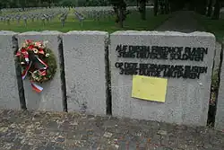 From the 1960s, protests were lodged against the German dead and the cemetery. The protests were revived in 2013, when the Dutch Anti-Fascists' League AFVN discovered that since the year 2000, the German ambassador had been holding yearly commemorations there.[2] In 2020, the AFVN started a petition[3] against the visits of the ambassador with Dutch and German Jews joining the effort,[4] along with Beate Klarsfeld and the management of the former Dachau concentration camp. A petition was launched to end the honouring and was subscibed bij a.o. the board of the Dachau Museum and Cponcentration camp, leading Jewish figures such as the Duitch chief rabbi Binyomin Jacobs. The ambassador ended the practice.