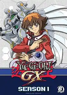 Yu-Gi-Oh! Duel Monsters GX (遊☆戯☆王デュエルモンスターズGX, Yū-gi-ō Dyueru Monsutāzu Jī Ekkusu) is the fourth addition to the Yu-Gi-Oh! anime meta-series, as well as the first main spin-off series. The plot centers around Jaden Yuki and his friends, and tells of their adventures at Duel Academy, a school that teaches students how to play the card game Duel Monsters. Season one, known as the Seven Stars Saga, covers their first year at the Academy. It was broadcast by 4Kids Entertainment as simply Yu-Gi-Oh! GX.
