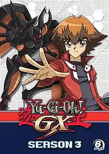 Yu-Gi-Oh! Duel Monsters GX (遊☆戯☆王デュエルモンスターズGX, Yū-gi-ō Dyueru Monsutāzu Jī Ekkusu) is the fourth addition to the Yu-Gi-Oh! anime meta-series, as well as the 1st main spin-off series. The plot centers around Jaden Yuki and his friends, and tells of their adventures at the Duel Academy, a school that teaches students how to play the card game Duel Monsters. Season three, the Dimension World Saga, covers their third year at the Academy and the series' darker turn. This season was broadcast by 4Kids Entertainment as Yu-Gi-Oh! GX.
