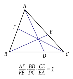 The Kitab al-Istikmal contains the first known formulation of Ceva's theorem, which only became known in Europe after 1678 from Italian geometer Giovanni Ceva's treatise De lineis rectis. It is unknown whether Al-Mu'taman discovered this theorem himself or obtained it from another source, and it is also unknown whether Ceva rediscovered the theorem independently.[3] The theorem can be stated as follows: "Let ABC be a triangle and D, E, F points on the sides BC, CA, and AB. We draw the lines AD, BE and CF. These three lines intersect at one point if and only if .