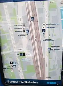 There is a tram and bus stop, called Bahnhof Wollishofen, west of the reception building. Another nearby stop is Bhf. Wollishofen/Werft, situated to the east of the station, is a bus stop. Zürich tram route 7 and VBZ bus routes 70, 184 and 185 stop at Bahnhof Wollishofen, while Bhf. Wollishofen/Werft is served by VBZ bus lines 161 and 165. The pier of Zürichsee-Schifffahrtsgesellschaft (ZSG), Wollishofen ZSG, is located southeast to the railway station.[7][4]