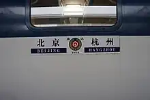 The Z9/10 Beijing-Hangzhou Through Train (Chinese: Z9/10次北京到杭州直达特快列车) is Chinese railway running between the capital Beijing to Hangzhou, capital of Zhejiang express passenger trains by the Beijing Railway Bureau, Hangzhou passenger segment responsible for passenger transport task, Hangzhou originating on the Beijing train. 25T Type Passenger trains running along the Hukun Railway and Jinghu Railway across Zhejiang, Shanghai, Jiangsu, Anhui, Shandong, Hebei, Tianjin, Beijing and other provinces and cities, the entire 1633 km. Beijing railway station to Hangzhou railway station running 13 hours and 53 minutes, use trips for Z9; Hangzhou railway station to Beijing railway station to run 13 hours and 40 minutes, use trips for Z10.