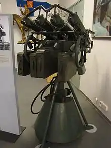 The ZPU (Russian: ЗПУ; зенитная пулемётная установка, romanized: zenitnaya pulemotnaya ustanovka, meaning "anti-aircraft machine gun mount") is a family of towed anti-aircraft guns based on the Soviet 14.5×114mm KPV heavy machine gun. It entered service with the Soviet Union in 1949 and is used by over 50 countries worldwide.