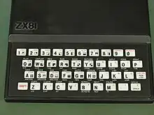 The ZX81 uses a standard QWERTY keyboard layout displaying 20 graphic and 54 inverse video characters.[4] However ZX81 BASIC commands are not typed in letter by letter, instead each key has up to five key functions. This is how the user displays the zx81's BASIC keywords, functions, mathematical operations and graphics.