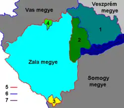 In 1854 Zala county (which at that time excluded Međimurje/Muraköz) comprised the following Stuhlbezirke (presented as they appear in the defining act):[8]