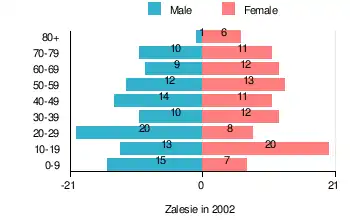 According to the 2002 Poland census, there were 204 people residing in Zalesie village, of whom 51% were male and 49% were female. In the village, the population was spread out, with 26.5% under the age of 18, 30.4% from 18 to 44, 20.6% from 45 to 64, and 22.5% who were 65 years of age or older.[1]