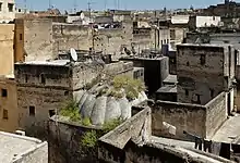 The zawiya's most prominent external features are its minaret, the tallest in the old city of Fez,[4][6] and the large green-tiled pyramidal roof over the mausoleum chamber. As a result, it is one of the most visible and easily identifiable buildings on the old medina's skyline. Up close, however, the zawiya is often obscured by the narrow lanes and the densely-packed buildings of the old city. On the zawiya's eastern side is a grid-like set of covered streets which make up a bazaar known as the Kissaria (also spelled kisariyya or qaysariyya), historically the central and most prestigious market in the city, situated between the two most important mosques of the city (the Qarawiyyin Mosque and Idris II's mosque/zawiya).[7] Further west, on the south side of Place Nejjarine, is the historic Hammam Moulay Idris which is associated with his tomb and traditionally considered to confer some of its blessings.[17][7][18]