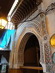 At the south end of the courtyard stands the large mausoleum chamber, where Moulay Idris II's tomb is located. The walls and the mihrab of the chamber are richly decorated with carved and painted stucco, mosaic tiles (zellij), and white and black marble columns.[6] The ceiling of the chamber is a large wooden dome, probably composed of hundreds or thousands of small wooden pieces fitted together to create a star-like pattern, as is typical of Moorish-Moroccan architecture.[23][24] The tomb itself is covered by a wooden baldaquin incrusted with gold and copper and elaborately decorated with gold Arabic calligraphy.[4][6] The mausoleum can also be directly accessed through a set of cedar-wood doors on the west side of the building, via an equally richly decorated vestibule.[4] (These doors are also the closest that non-Muslims can get to the Mausoleum's interior.[20]) The east side of the complex, adjacent to the courtyard and the mausoleum, is a roofed hypostyle space for prayer, including the mosque space built by Sultan Abd al-Rahman in 1824.