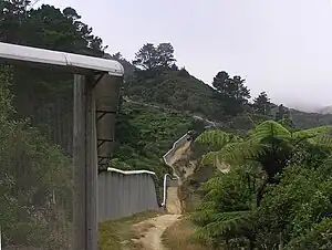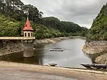 Historically about 60% of the Wellington region was covered with broadleaf forest. Karaka, kohekohe, ngaio and nīkau trees were common but there were also rata, rewarewa and tawa with occasional podocarps like kahikatea and rimu.[5] The whole sanctuary valley was covered with this sort of forest until European settlement of the area and the large fires in 1850 and 1860 that cleared the land to be used for farming. The lower reservoir, retained by an earth dam, was completed in 1878.[6] Parts of the area continued to be farmed up until 1906 when the remaining catchment was purchased for the water works.[6] The upper reservoir, retained by a concrete gravity arch dam, was completed in 1908.[7] From this point, as the whole valley was a protected water catchment area for Wellington city, the slopes were re-vegetated with introduced trees and the native forest also began regenerating. The upper dam was decommissioned as a reservoir about 1991, the lower one in 1997.[6]