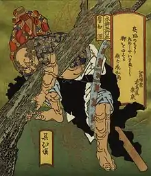 Zhou's portrayal as their teacher is connected to a recurring element in Chinese fiction where Tang and Song dynasty heroes train under a "celestial master", usually a Taoist immortal, prior to their military exploits.[71] C. T. Hsia suggests the mold from which all other similar teachers are cast is Guiguzi, master of the feuding strategists Sun Bin and Pang Juan,[72] from the Yuan dynasty tale Latter Volume of the Spring and Autumn Annals of the Seven Kingdoms (七國春秋後集).[71] Hsia goes on to say that Qian Cai, Yue's fictional biographer, associated Zhou with the outlaws because "most such teachers [in the military romance genre] are celestials" with at least two students.[73] But in adopting this format, Qian reversed the traditional pattern of "celestial tutelage" since Zhou is written as a human, while his students are reincarnations of demons (Lin and Lu) and the celestial bird Garuda (Yue Fei).[74][75]