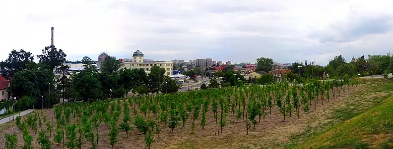 Zielona Góra is surrounded by tree-covered hills. The adjacent woodland makes up approximately half of the city's total area. The name of the city translates to 'Green Mountain' in both Polish and German. Zielona Góra features several tourist attractions and important historical sites including the preserved medieval Old Town, 13th-century Market Square, tenements, palaces, parks and the famous Palm House on Wine Hill. Its strong connection to vineyards and grape-picking earned Zielona Góra the nickname "The City of Wine".[25]