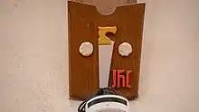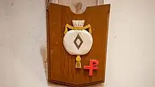The first shield we will examine is found as you first enter the nave looking up at the trusses on the left side. We will then work our way forward from the choir loft towards the pulpit area. The first shield depicts Two Keys and represents Simon Peter, Andrew's Brother, called Peter by Jesus of Nazareth. Traditionally, St. Peter is represented holding Two Keys of equal size, which is explained by the Savior in the Gospel of Matthew: “And I will give unto thee the keys of the kingdom of heaven: and whatsoever thou shalt bind on earth shall be bound in heaven: and whatsoever thou shalt loose on earth shall be loosed in heaven” (Matthew 16:19).