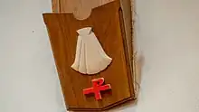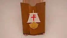 Our ninth shield depicts a Boat. This represents Jude, who was the brother of the apostle St. James the Less. Both were related to Jesus as distant cousins. St. Jude has been credited as the author of the brief Epistle of St. Jude found in the New Testament. The boat is the symbol most often associated with St. Jude alludes to Jude's earlier life, and to Jude's voyages in his part in the mission of founding the early church. A ship is also a well-known symbol of the Christian Church. It was also a great symbol during times when Christians needed to disguise the cross, since the ship's mast forms a cross in many of its depictions.