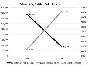 Anthropologist Anne de Jong says that early Zionists promoted a narrative of binary conflict between two competing groups with equally valid claims in order to deflect criticisms of settler colonialism.[43] In 2013, historian Lorenzo Veracini argued that settler colonialism has been successful in Israel proper but unsuccessful in the territories occupied in 1967.[44] Historian Rashid Khalidi argues that all other settler-colonial wars in the twentieth century ended in defeat for colonists, making Palestine an exception: "Israel has been extremely successful in forcibly establishing itself as a colonial reality in a post-colonial age".[45]