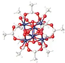Zirconium acetate usually refers to the chemical formula Zr6O4(OH)4(O2CCH3)12. It forms by the reaction of zirconyl chloride and acetate. Claims of Zr(O2CCH3)4[1] have been superseded by experiments using X-ray crystallography.[2]
