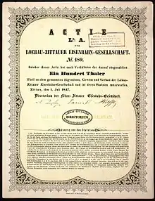The Löbau-Zittau Railway Company (German: Löbau-Zittauer Eisenbahn-Gesellschaft) received a concession on 25 June 1845 to build a line from Löbau to Zittau. The line was opened on 10 June 1848. The line was initially also operated by the Löbau-Zittau Railway.
