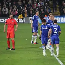 On 11 March, Ibrahimović received a straight red card in a Champions League round of 16 match against Chelsea at Stamford Bridge, for a foul on Oscar. PSG drew 2–2 after extra time to qualify for the quarter-finals on away goals.[129] Nine days later, he scored a hat-trick in a 3–0 win over Lorient at the Parc des Princes.[130][131][132] He netted another hat-trick on 8 April as PSG reached the 2015 Coupe de France Final with a 4–1 win over Saint-Étienne, starting with a penalty for his 100th goal for the club. He ended the match with 102 career goals for PSG, second only to Pauleta.[133][134] Three days later, he scored twice as PSG defeated Bastia 4–0 in the 2015 Coupe de la Ligue Final. The first goal was a penalty which he won when fouled by Sébastien Squillaci, resulting in the Bastia defender's dismissal.[135]