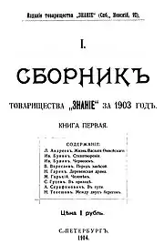 Znanie initially published books for a mass audience on natural science, history, education, and art. Maxim Gorky joined Znanie in 1900 and became its director in late 1902. Through Znanie, Gorky brought together many of the best known realist writers of the time. Znanie published the collected works of Gorky (9 vols.), Alexander Serafimovich, Alexander Kuprin, Vikenty Veresaev, Stepan Skitalets, Nikolai Teleshov and many others.[1][2]